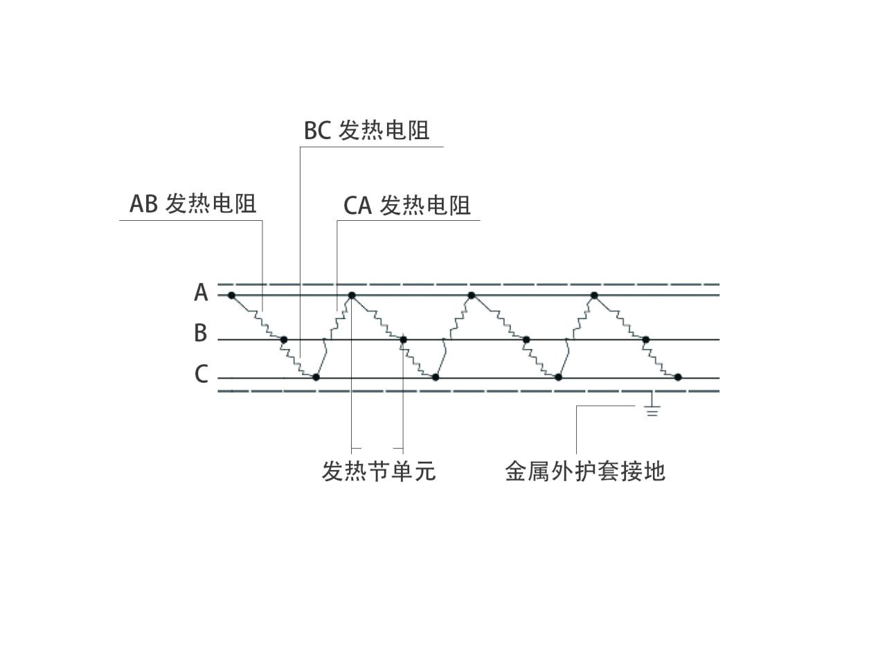 三根相互平行包覆在絕緣層中的鍍錫銅絞線,作為電源母線,并在其外表加覆一層絕緣層作為內護套層,在其表面纏繞電阻絲,電阻絲每隔一定的距離(發熱節)與母線連接,形成連續并聯電阻,母線通電后,各并聯電阻發熱,因而形成一條連續發熱的電伴熱帶?扇我饧羟;金屬編制層(需接地)在提高抗拉強度的同時也避免了靜電的產生。